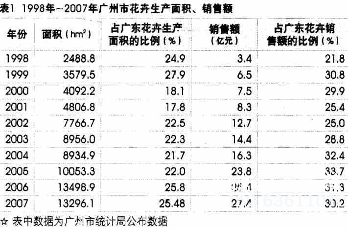 广州花卉温室大棚设施栽培从20世纪80年代中开始发展,随着花卉生产的科技水平、产品的技术含量不断提高,90年代后期为发展高潮。从表1可见,近10年来,广州花卉业在稳步发展,种植面积和销售额逐年同步增长,分别占据了全省花卉种植面积和销售额近1/4和1/3的比例,均居全省之冠。花卉保护地面积随花卉业的发展也在逐年增大,其中上世纪90年代未所占全市花卉种植面积的比例较大,约1/4;2000年以后所占比例有所回落,基本保持在15%左右。